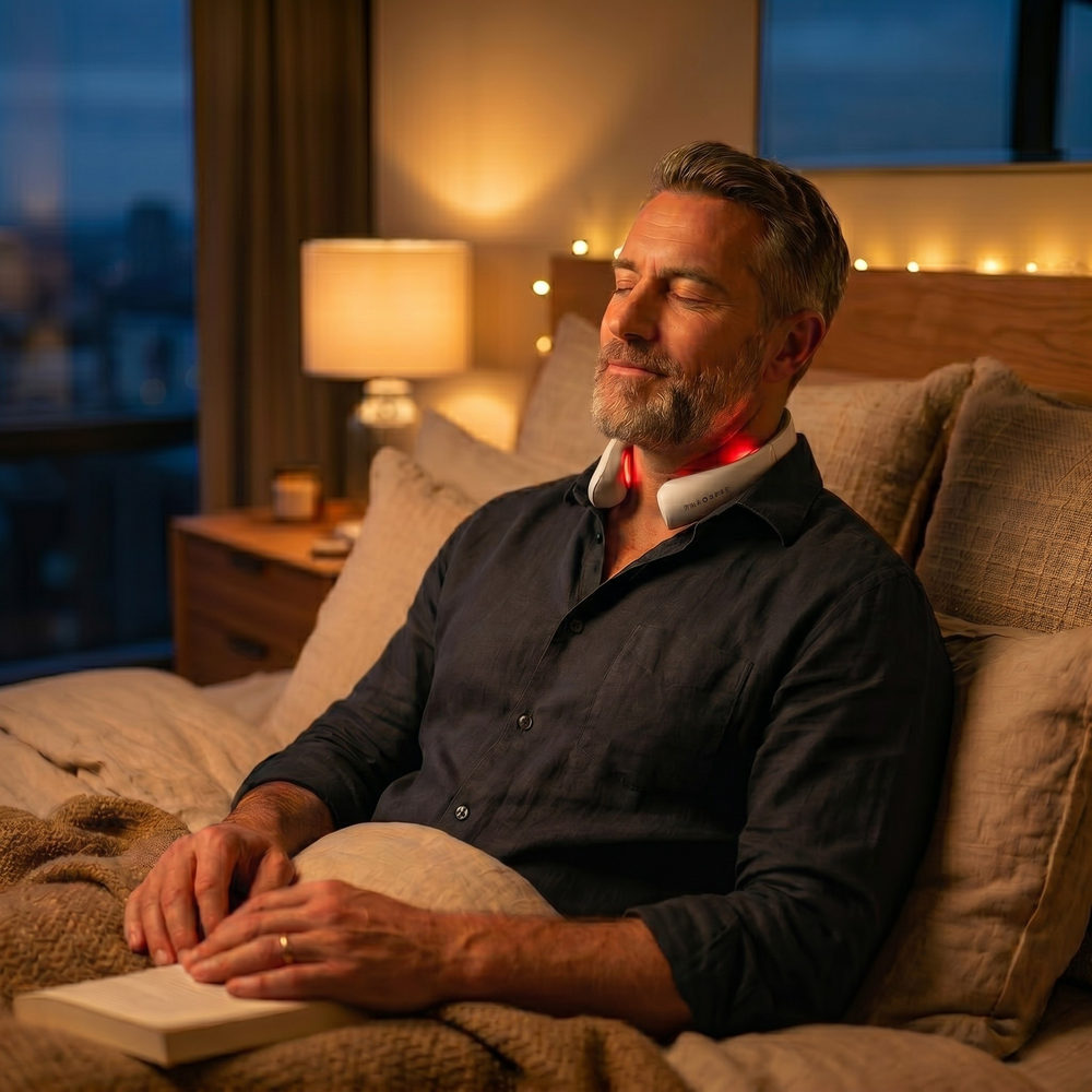 Le protocole de récupération de 15 minutes utilise une stimulation ciblée (TENS + EMS) pour réinitialiser activement les muscles cervicaux après des périodes de charge statique. Placez l'appareil autour de votre cou, sélectionnez votre mode avec le cadran, et laissez les impulsions douces agir pendant 15 minutes. L'appareil s'éteint automatiquement. Sans app, sans câbles, sans préparation.